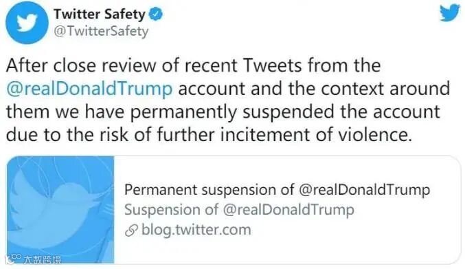 推特进一步表示,在1月6日推特宣布冻结特朗普账号12小时的时候就明确表示,如果特朗普账号继续违反平台政策,将导致账号永久停用。