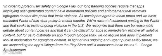 然而不久,谷歌APP商店已在声明中宣布下架Parler,理由是这款APP上“存在大量煽动暴力的言论”,并要求Parler做出整改,否则不得重新上架。