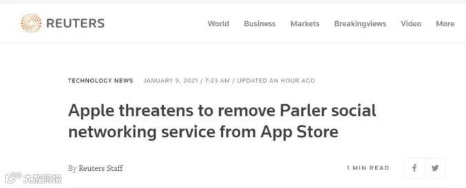 而Parler的CEO在8日也向路透社表示,自己还收到了来自苹果商店的声明,该声明称,如Parler不肯对其一贯以来的发言规则作出修改,苹果商店将对Parler这款APP做下架处理。