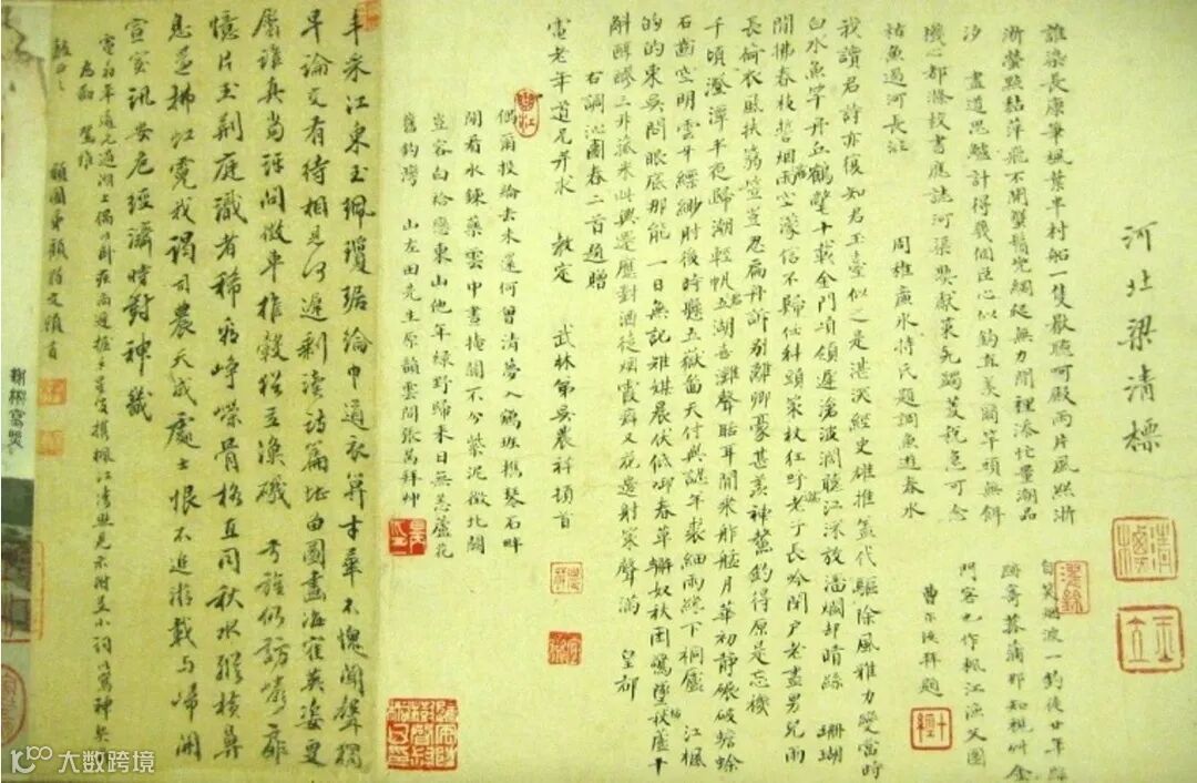 拖尾题者众多,包括徐乾学、汪懋麟、陶征、孙枝蔚、徐元文、黄与坚、田雯等共得七十二人,为该画组成一个庞大的题咏部队。自康熙乙卯(1675)绘成以迄康熙乙亥(1695)菊庄付刻的二十年间,题咏者陆续累增至近百人,题作超过一百三十篇以上,均为顺、康时期文坛要人:遗老、逸民、布衣诗群与辇毂诸公,足征一代风流。《枫江渔父图》是个集体文本,七十多则题跋接力对话,密密织就成一张交际网。题跋者在画幅上组织跨时空的读书雅集,成立了纸上的“文学沙龙”(literary salon)。