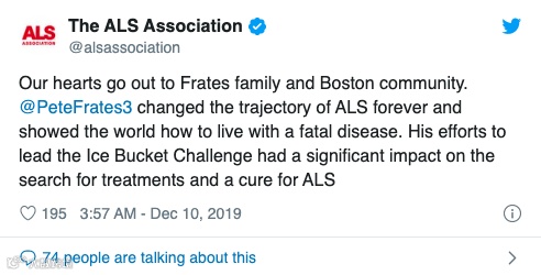 “冰桶挑战”的另一位发起人彼得 · 弗莱茨(Pete Frates)因渐冻症于2019年12月9日离世,享年34岁。