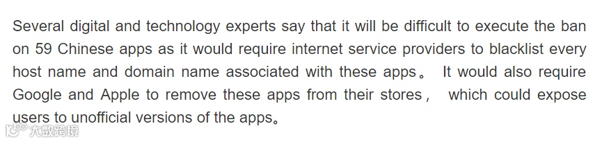 “几位数字技术专家认为,执行对59个中国APP的禁令会比较困难,因为这需要互联网服务提供商将每一个与这些APP有关的主机名和域名拉入黑名单。它还需要谷歌和苹果也要将这些APP从其商店移除,这有可能使用户接触这些APP的非官方版本。”