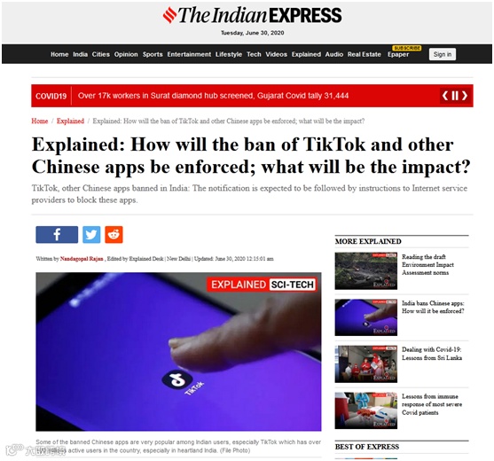 “解释:对TikTok与其他中国应用的禁令将如何执行?又会带来什么影响?”《印度快报》30日以此为题的报道称,被禁名单上部分应用在印度非常受欢迎,尤其是TikTok,其在印度拥有超过1亿活跃用户,主要分布在印度中心地带。