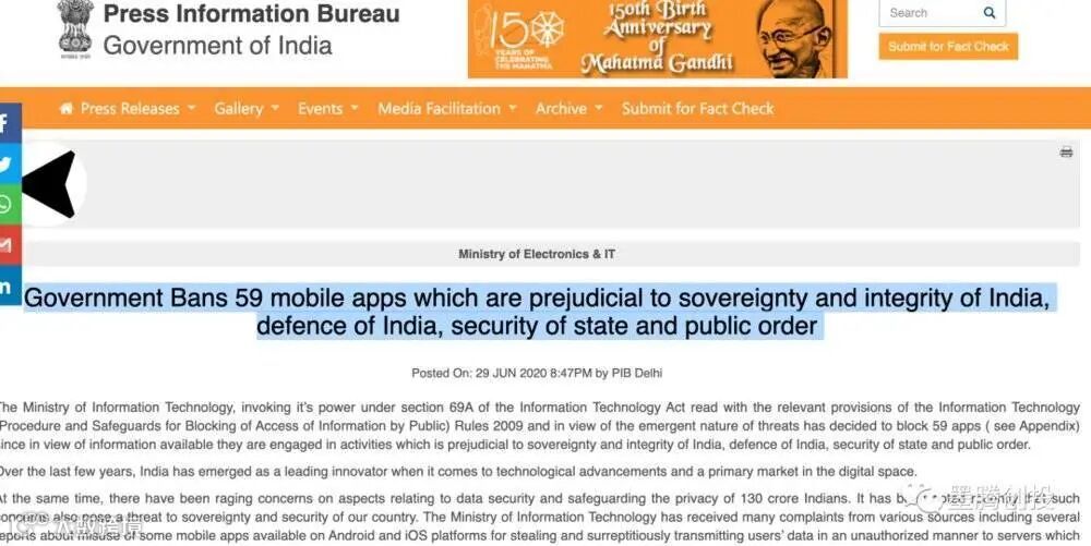 6月29日,印度信息技术部宣布禁用59款中国应用。