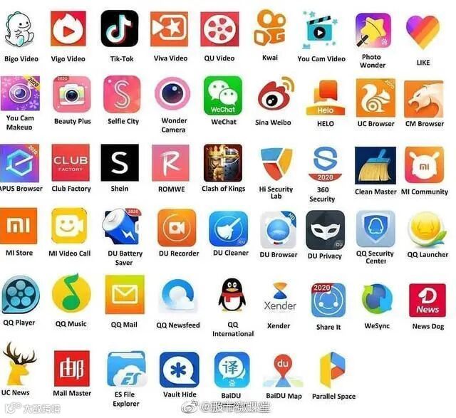 里面的TikTok、微博、UC浏览器、微信、QQ、快手和美图等都是我们耳熟能详的。