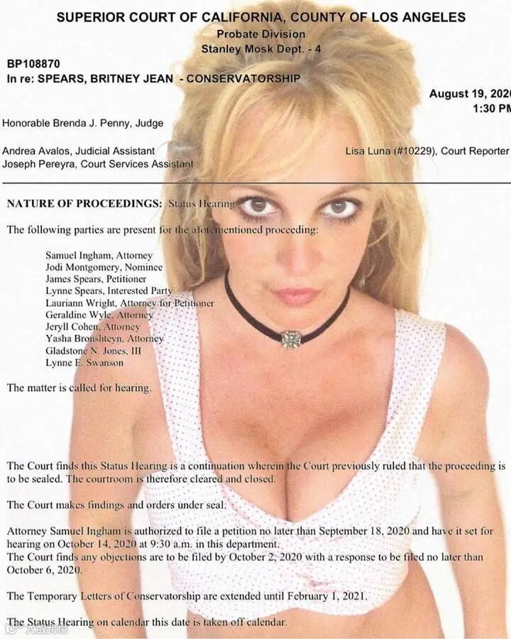 布兰妮监护案8月19日庭审结束,法院决定暂时延长监护至2021年2月1日,且由Jodi Montgomery继续担任临时监护人。