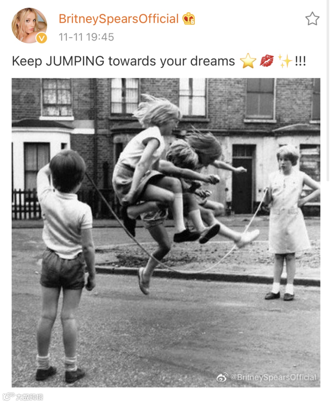 当地时间11月10日,洛杉矶法院拒绝了布兰妮·斯皮尔斯要求解除其父杰米对其监护权的要求。随后这位流行歌手在Instagram上发布了一张黑白照片,照片上是孩子们在跳绳。在配文中,她写道:“坚持向你的梦想跳跃。”