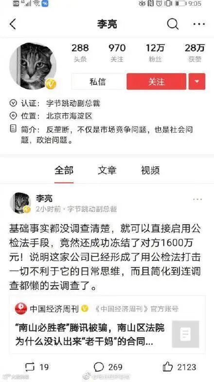 在其个人头条号上谈及腾讯与老干妈广告乌龙事件,“基础事实都没调查清楚,就可以直接启用公检法手段,竟然还成功冻结了对方1600万元!说明这家公司已经形成了用公检法打击一切不利于它的日常思维,而且简化到连调查都懒的去调查了。”
