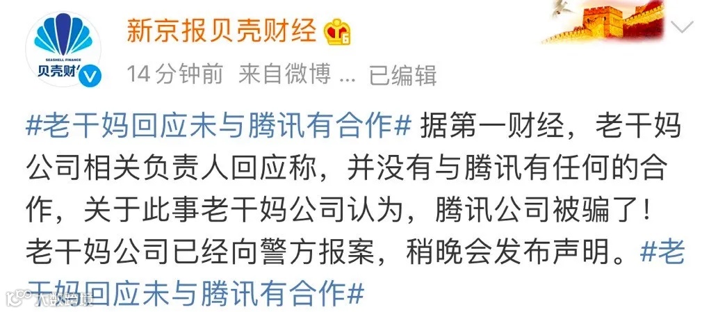 昨日晚间,针对“腾讯被骗”一事,老干妈方面回应称,腾讯公司从来没有催收过广告费。