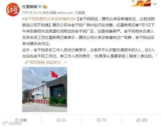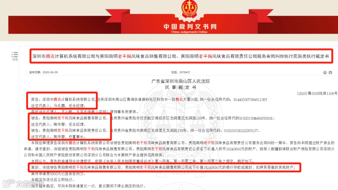 腾讯方面称,老干妈在腾讯投放了千万元广告,但长期拖欠不还钱,只好被迫依法起诉,申请冻结了对方应支付的欠款金额。