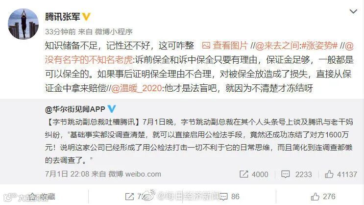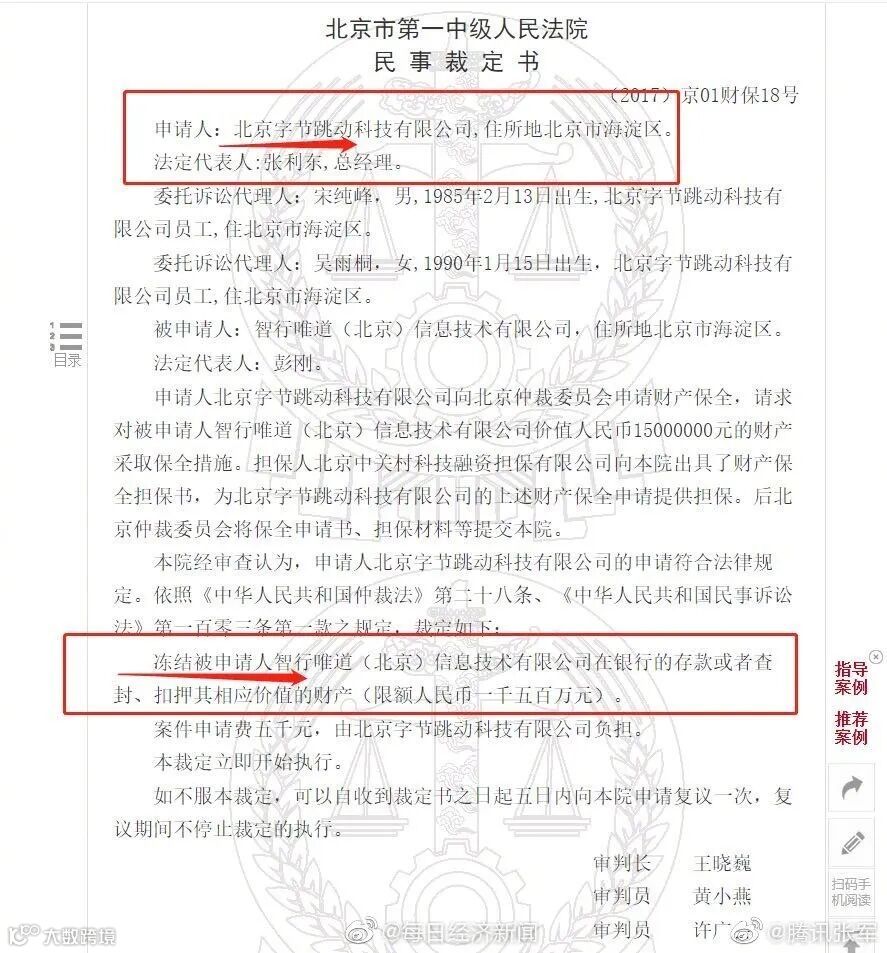 腾讯张军立刻出来反击,说他知识储备不足。贴出字节跳动冻结智行唯道财产的裁定书。