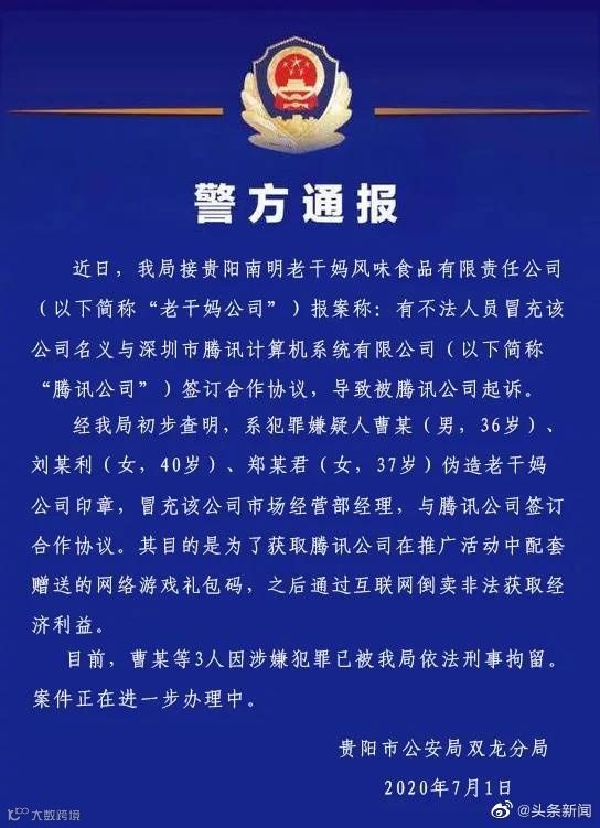 贵阳警方通报,有三个人私刻萝卜章,与腾讯签合同,其目的是为了倒卖配套送的游戏礼包码。