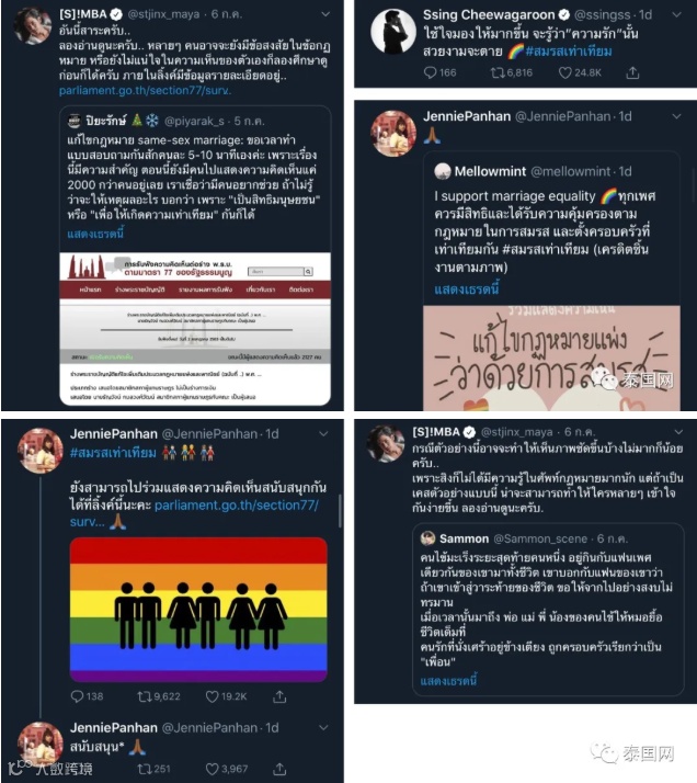 泰国娱乐圈的明星Win、Gulf、Jennie、Namtan、Pluem、Woody、Singto、Tawan等纷纷在个人社交账号发帖或转帖分享婚姻平等。