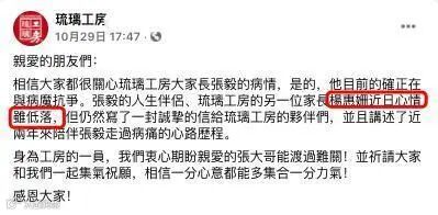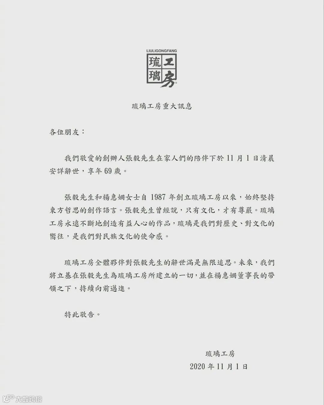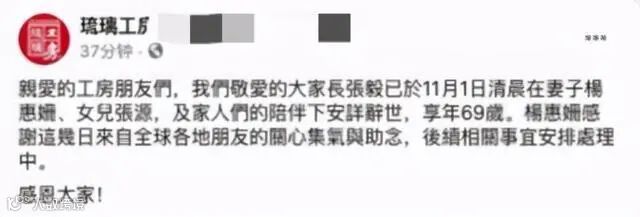 琉璃工房的官方账号还透露,张毅是于11月1日清晨在妻子杨惠姗、女儿张源,及家人们的陪伴下安详辞世的。