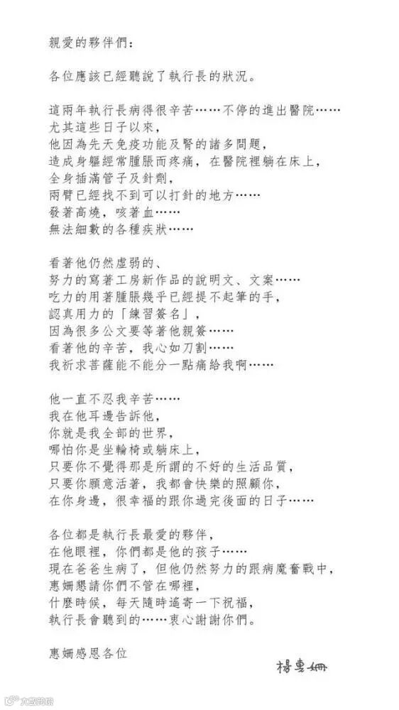 29日,琉璃工房分享了杨惠珊写给员工的一封信,内容诚挚,讲述了近两年来陪伴丈夫走过病痛的心路历程。