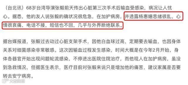 10月28日时,就有台湾媒体报道称,张毅被曝在做心脏手术后输血感染,病情危急,已送往加护病房,一时间引起无数人担忧。