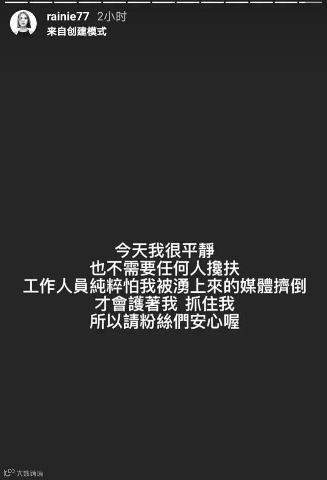 作为黄鸿升的前女友以及好朋友,杨丞琳这几天的状态,粉丝们都是非常担心的。而当天杨丞琳现身黄鸿升灵堂,因为当时有工作人员搀扶了一下杨丞琳,所以很多粉丝都担心杨丞琳因为过度伤心,现在的身体状况是不是不太好。所以杨丞琳发动态表示:今天我很平静,不需要任何人搀扶,工作人员纯粹怕我被涌上来的媒体挤倒,才会护着我,抓住我,所以请粉丝们安心哦。