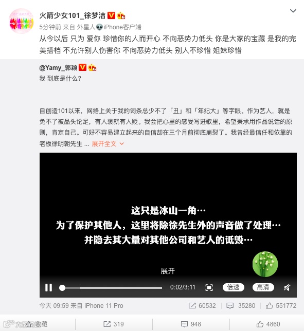 前火箭少女队长Yamy公开了一则经纪公司会议的录音,老板徐明朝当着员工的面说她很丑,不时尚,没有价值,唱歌难听……