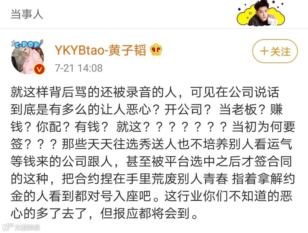 不久后黄子韬也发声表态,表示其行为令人恶心。