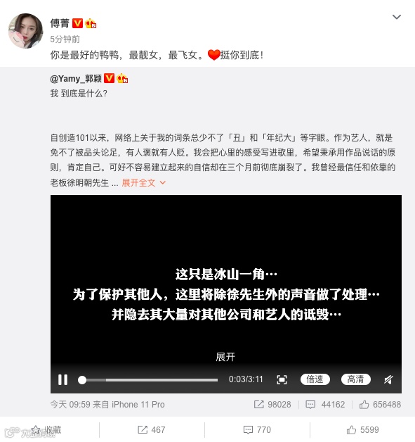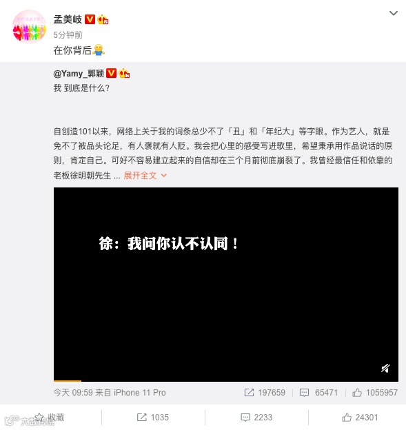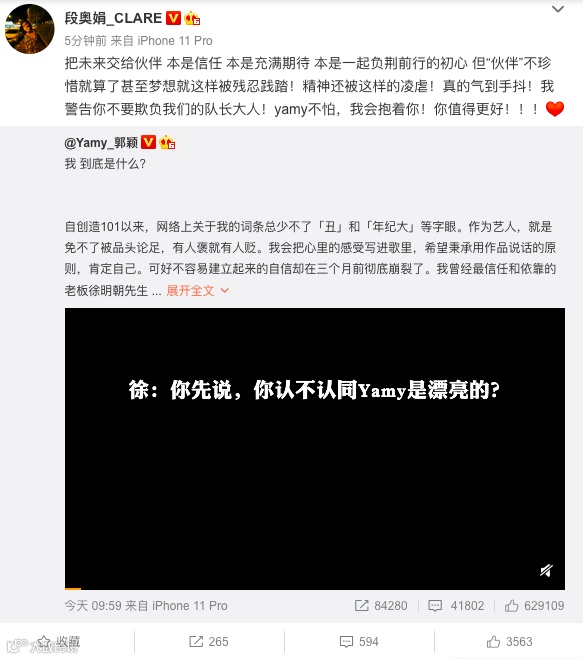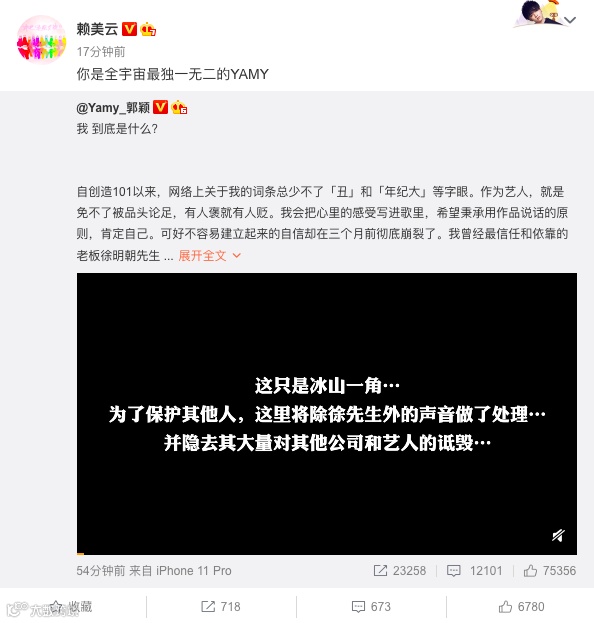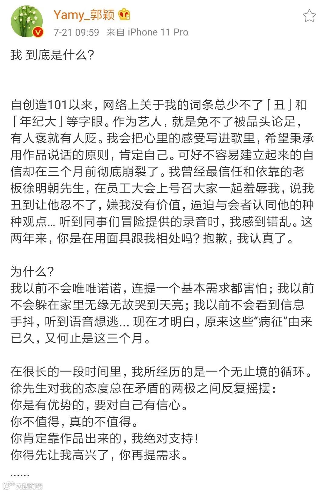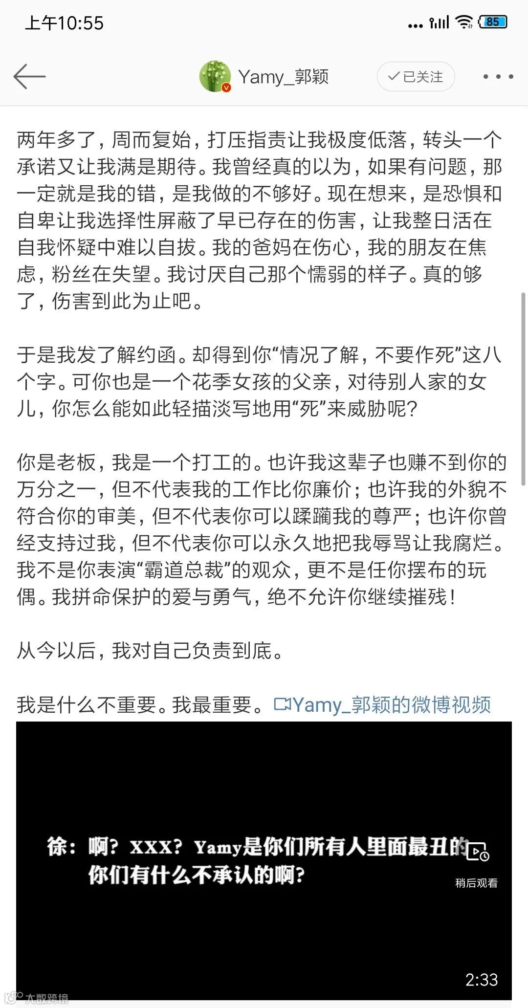 Yamy微博也表示老板过去两年经常打压指责她,自己提出解约时,老板表示“情况了解,不要作死”。