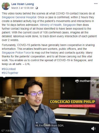 李显龙在3月3日发表脸书并转载了mothership.sg的一段关于“接触者追踪员”的采访视频,并高度赞扬了他们在抗击疫情中的贡献。
