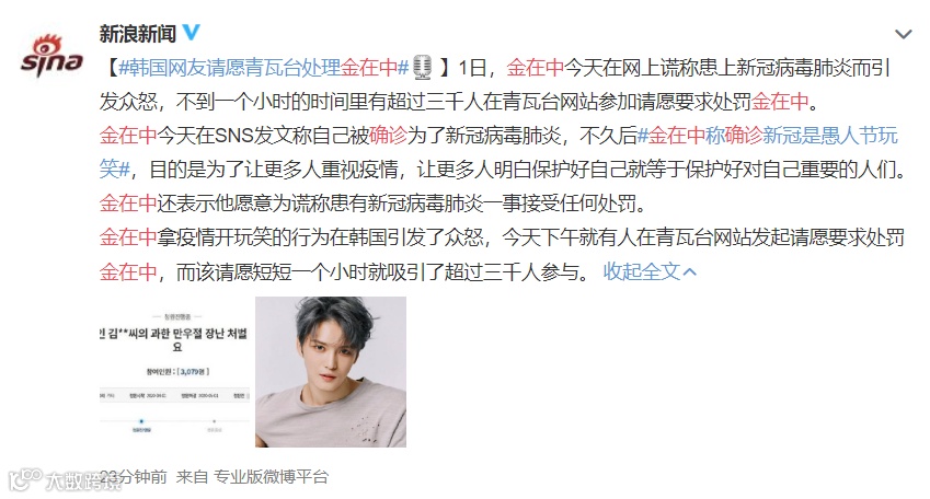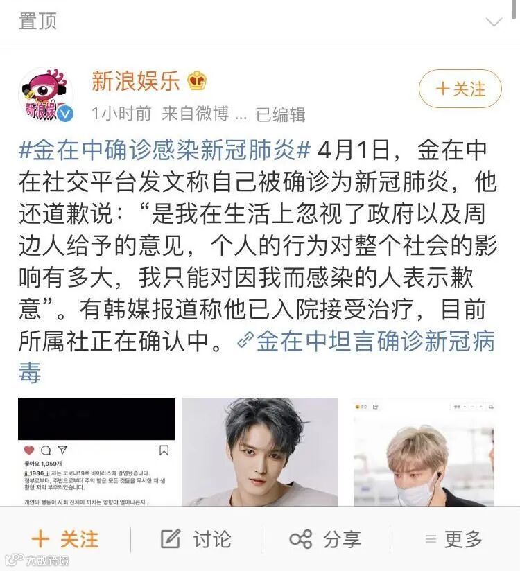 消息刚出的时候,朋友圈都是转发金在中确诊消息的,而微博上的评论都希望“这是愚人节的玩笑”。