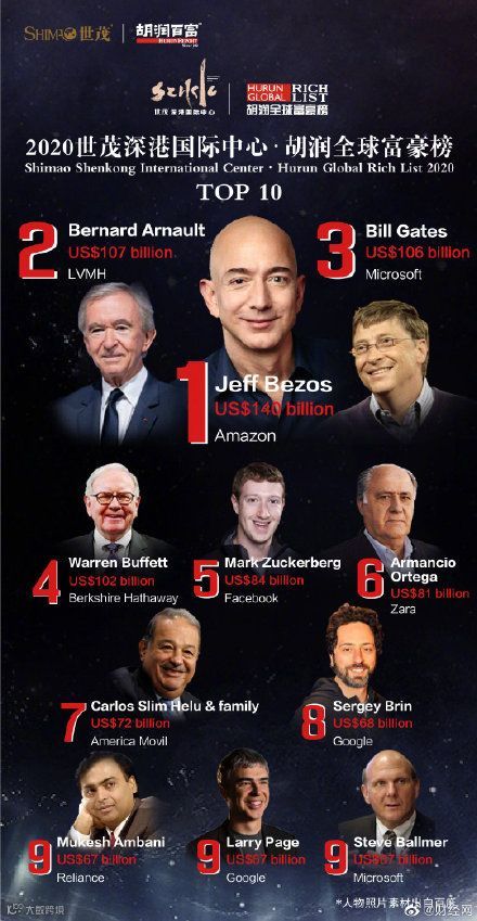 2月26日,胡润发布2020胡润全球富豪榜。贝索斯连续第三年成全球首富 ,身家9800亿人民币。