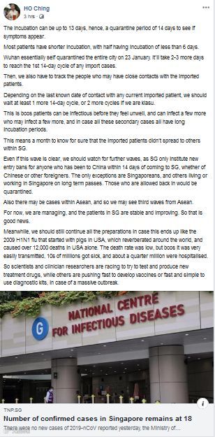Even if this wave is clear, we should watchfor further waves, as SG only institute new entry bans for anyone who has beento China within 14 days of coming to SG, whether of Chinese or otherforeigners. The only exceptions are Singaporeans, and others living or workingin Singapore on long term passes. Thosewho are allowed back in would be quarantined.