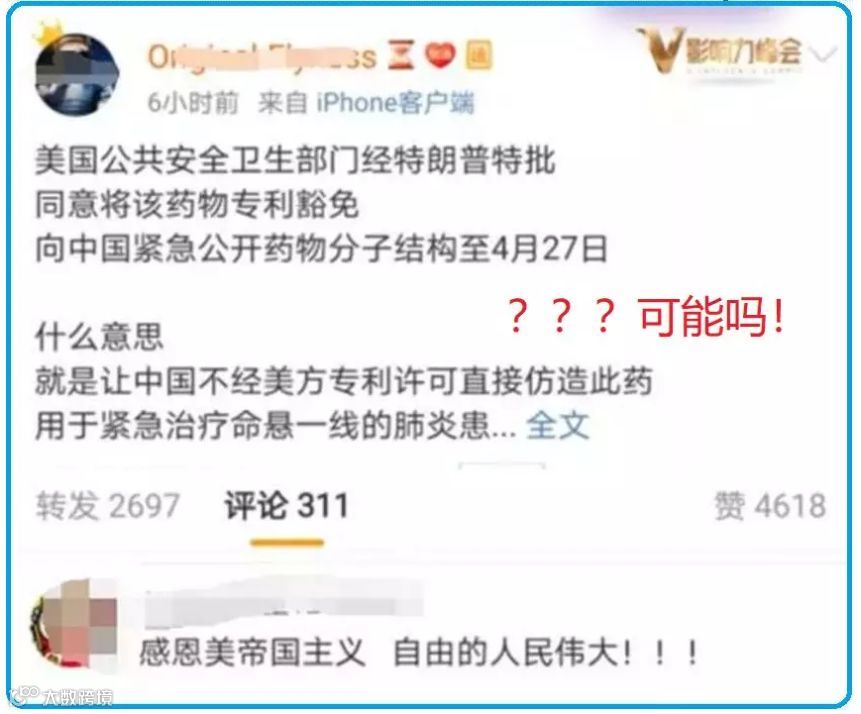 近日,有人高呼万岁,声称美国科学家和医生将奔赴武汉一线义诊;有人感激涕零,转发新闻欢呼说美国率先对华捐助物资;还有人激动不已,奔走相告地表示美国特批免费转让特效药专利权给中国,允许中国随便仿制云云……