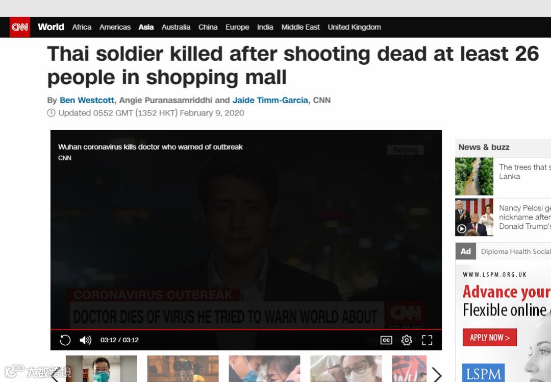 泰国总理巴育在今天(2月9日)召开记者会表示,一名泰国士兵在泰国东北部Korat的一个购物中心枪击案中杀死27人(包括枪手),打伤57人,该士兵已被警方击毙,结束了长达17小时的对峙行动。