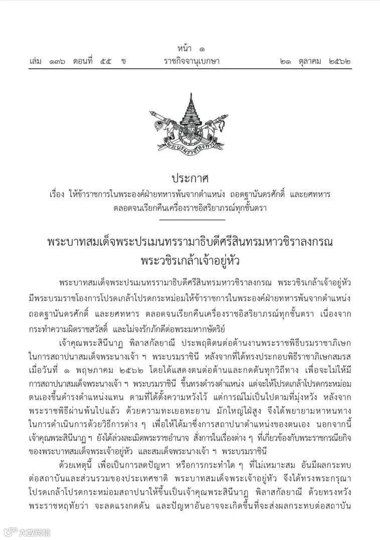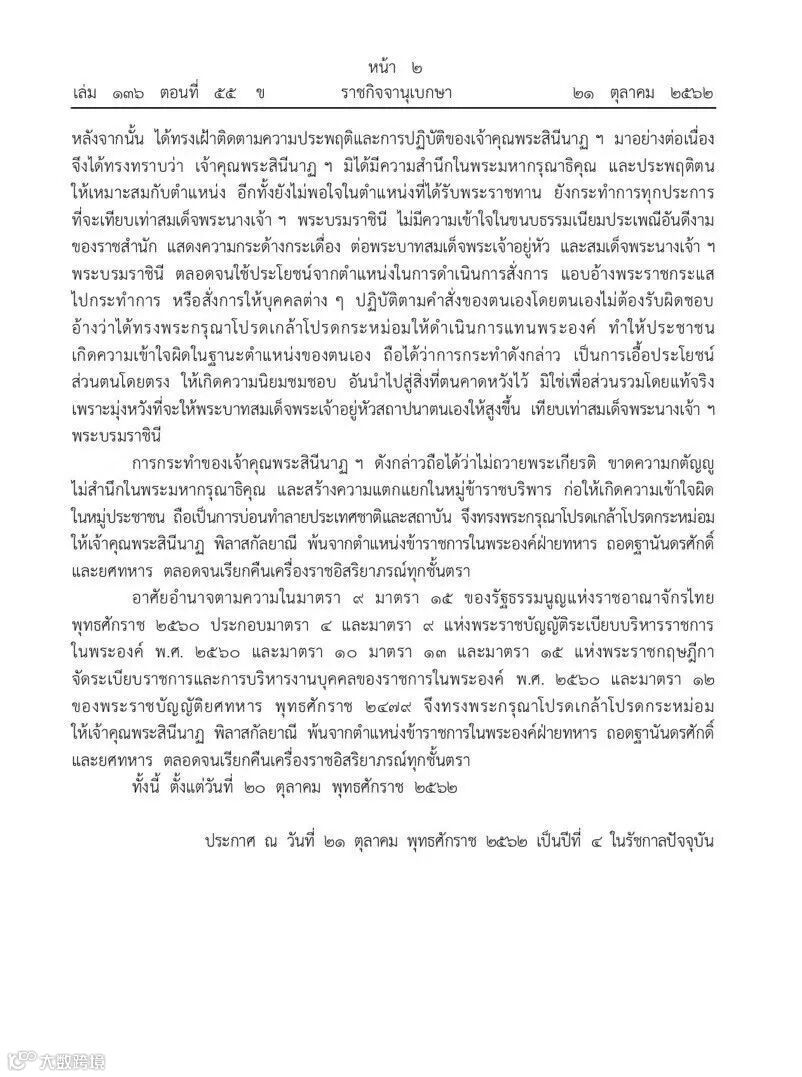 ❒ 泰国王室公布 10月21日晚,泰国皇宫事务办公室忽然发布公告传达国王的旨意,正式废除诗尼娜贵妃(本文后统称贵妃)身份,此公告立刻在各大新闻、电视台、各大网站、广播向泰国全国民众传达。