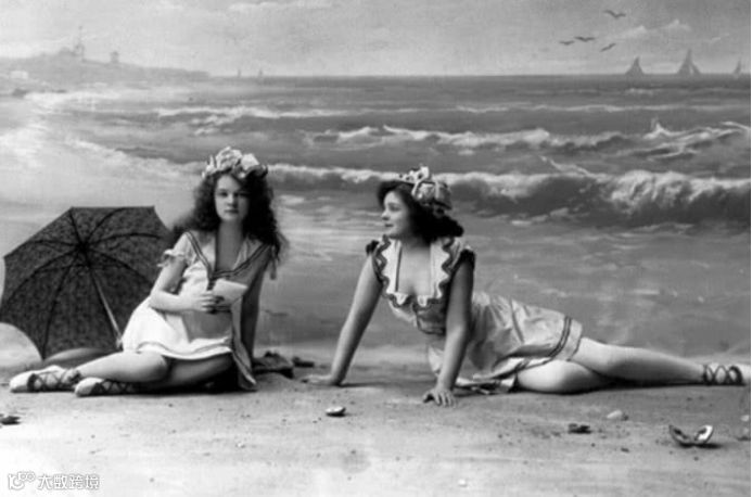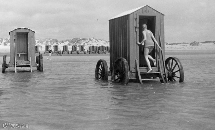 欧洲游泳爱好者会在车轮上的更衣室换泳衣。女性会将泳衣边缘部分缝紧,以防衣服向上缩,露出她们的大腿。