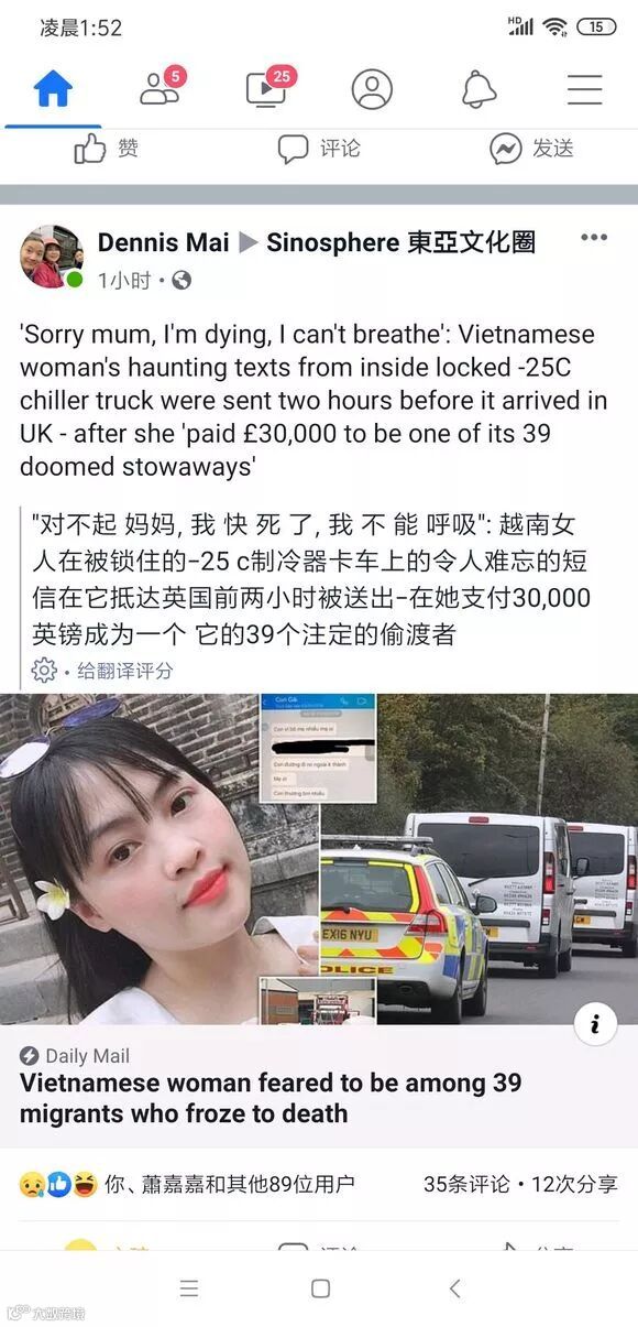 可谁曾想到在他们之中,在那个狭小的集装箱空间中,向这个世界发出的最后一则讯息却是这样的:“对不起,爸爸妈妈。我的出国之路失败了。我非常爱你们。我无法呼吸……”范氏茶眉(音译,Pham Thi Tra My)与妈妈短信告别。