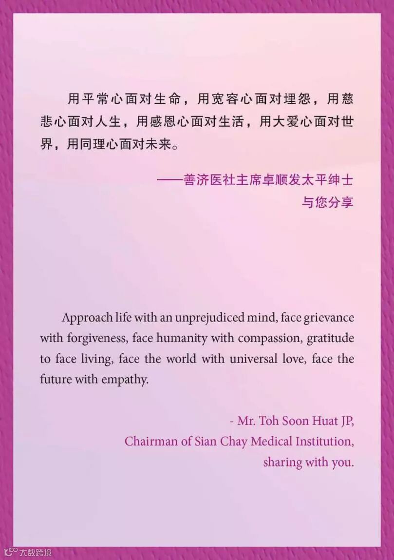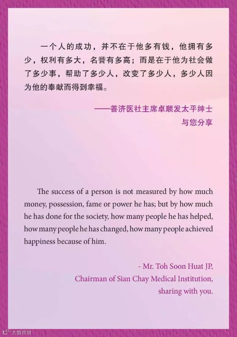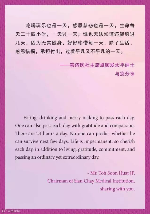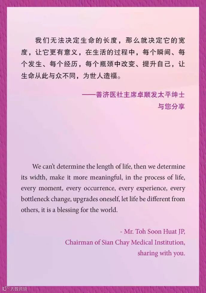 卓顺发主席说:我们无法决定生命的长度,那么就决定它的宽度,让它更有意义,在生活的过程中,每个瞬间,每个发生,每个经历,每个瓶颈中改变、提升自己,让生命从此与众不同,为世人造福。