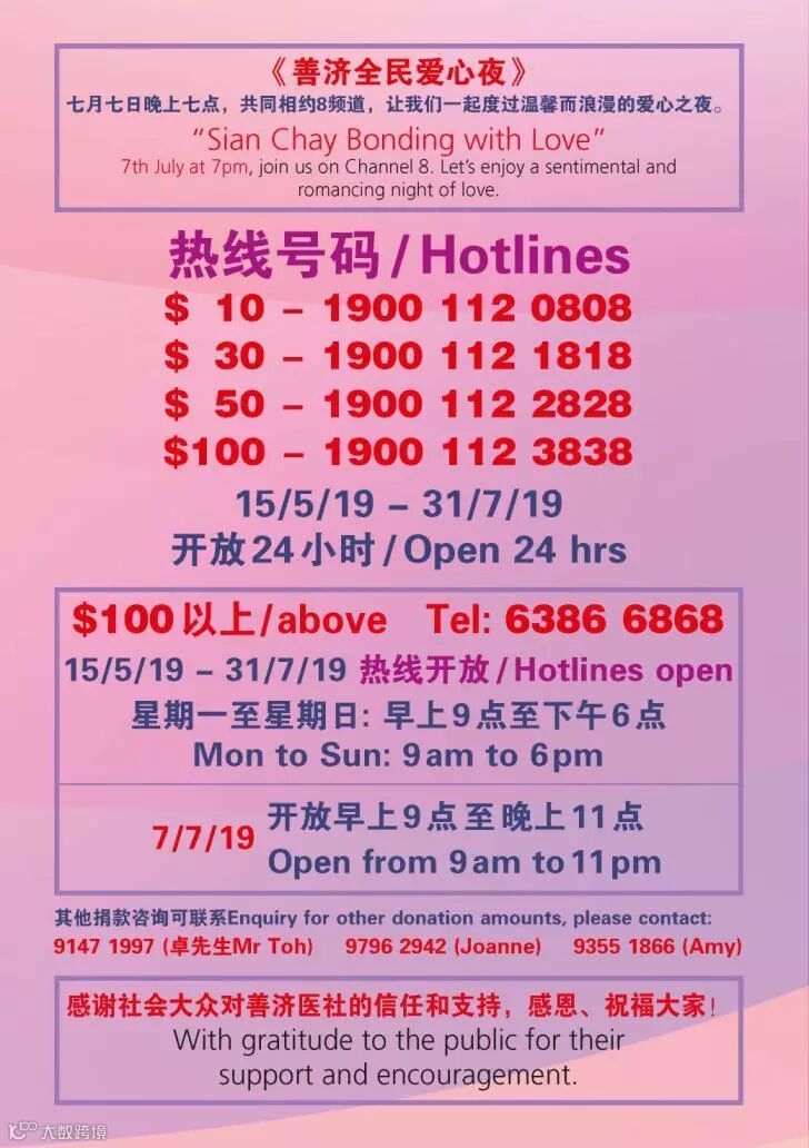 5月15日至7月31日(24小时)公众可拨打以下捐款热线: