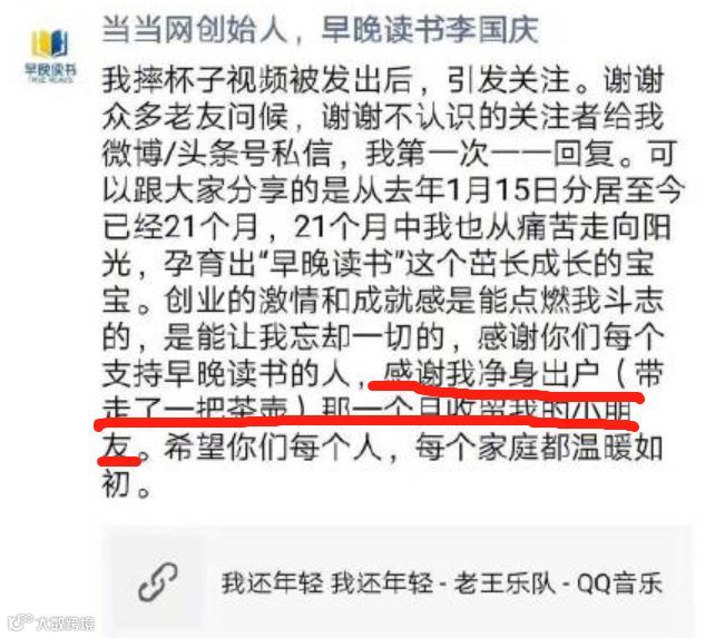 10月19号,李国庆发了一条朋友圈里,主要就是在卖惨,其中有一句这么说的:“感谢我净身出户(带走了一把茶壶)那一个月收留我的小朋友。”