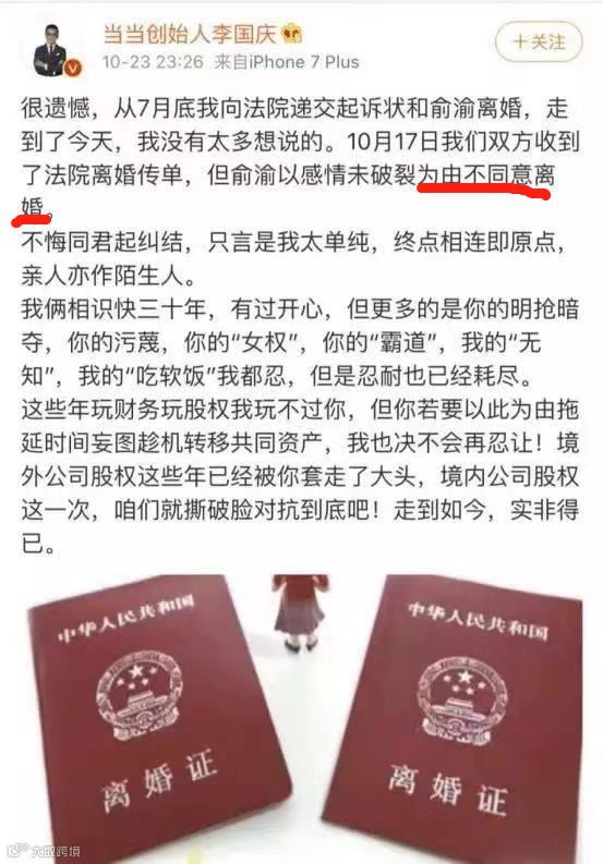 在这篇血泪长文发表前的一个多小时,他义正言辞的跟结发妻子俞渝再次提出离婚。