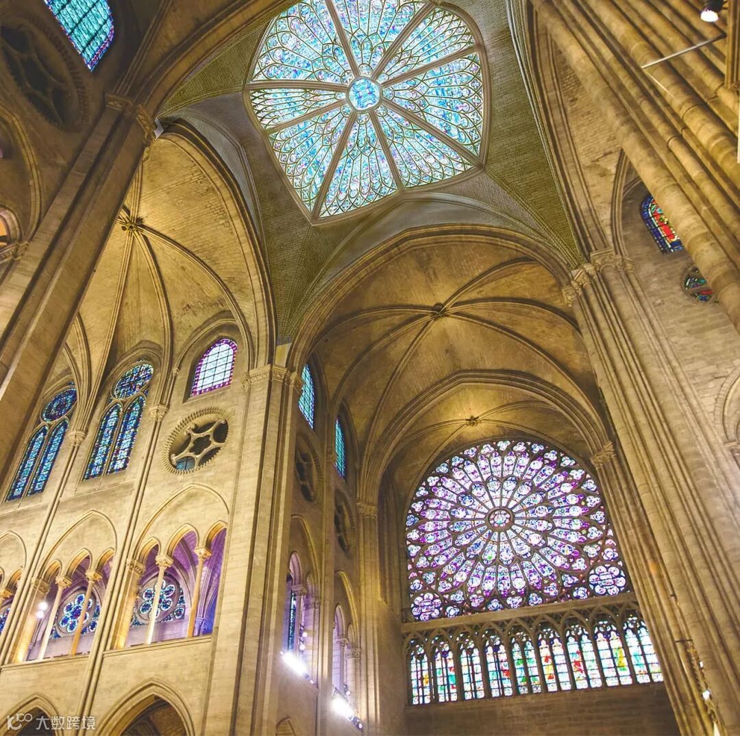 塔尖的内部则创造了一个城市万花筒。充满活力的彩色玻璃使光线染色,透露着巴黎圣母院玫瑰之窗的浪漫之美。