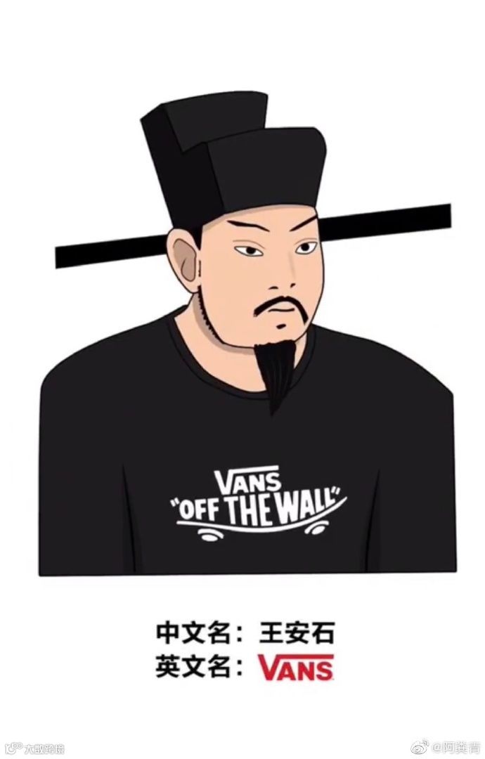 今日,微博话题 #如果王安石有英文名# 火了,博主 @阿粪青 将王安石的英文名与美国滑板品牌VANS联想到了一起,令人忍俊不禁。同时,这也让网易新闻东莞运营中心的小编们脑洞大开。