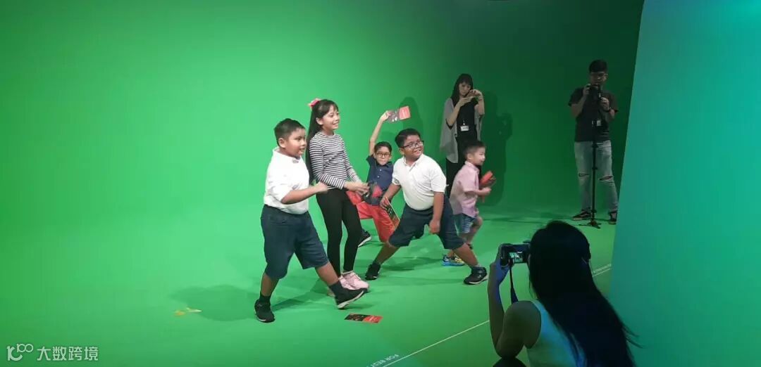 一群小朋友们正在玩拍照,背景是绿色墙,拍下后的照片上背景显示的却是机场。