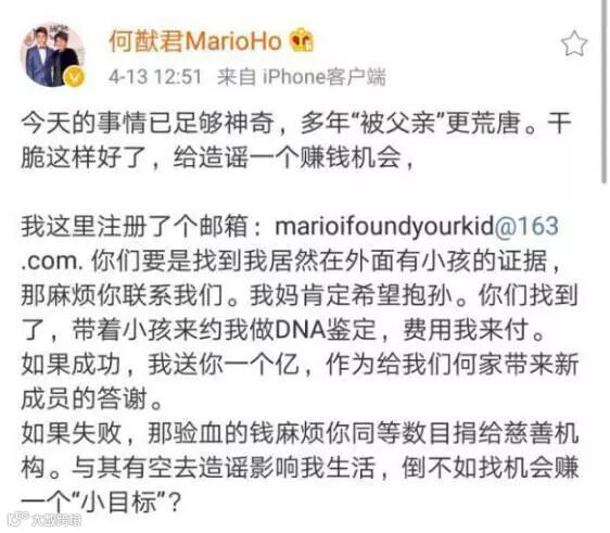 何猷君辟谣女友奚梦瑶怀孕后,又怒发微博辟谣自己没有私生子一说。