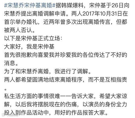 宋慧乔方紧跟着,发声明回应称双方性格不合,无法克服,不得已做出离婚决定。