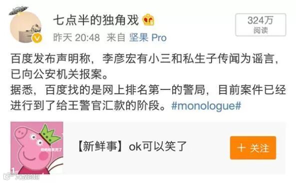百度虽然官方第一时间进行了辟谣,本以为这件事就这么过去了,但随后,网友“七点半的独角戏”在微博发了一条“monologue”,内容是: