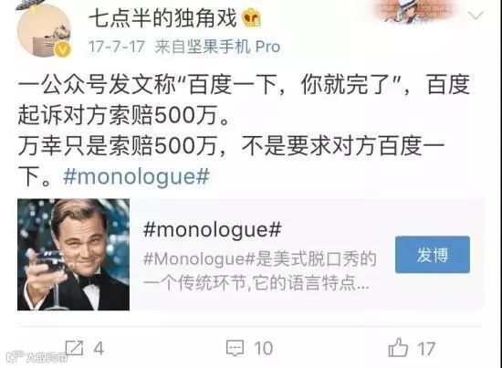 还有网友发现“七点半的独角戏”曾于2017年发过一条关于百度索赔的微博,调侃称“赔偿数字是不是参考的这条?”