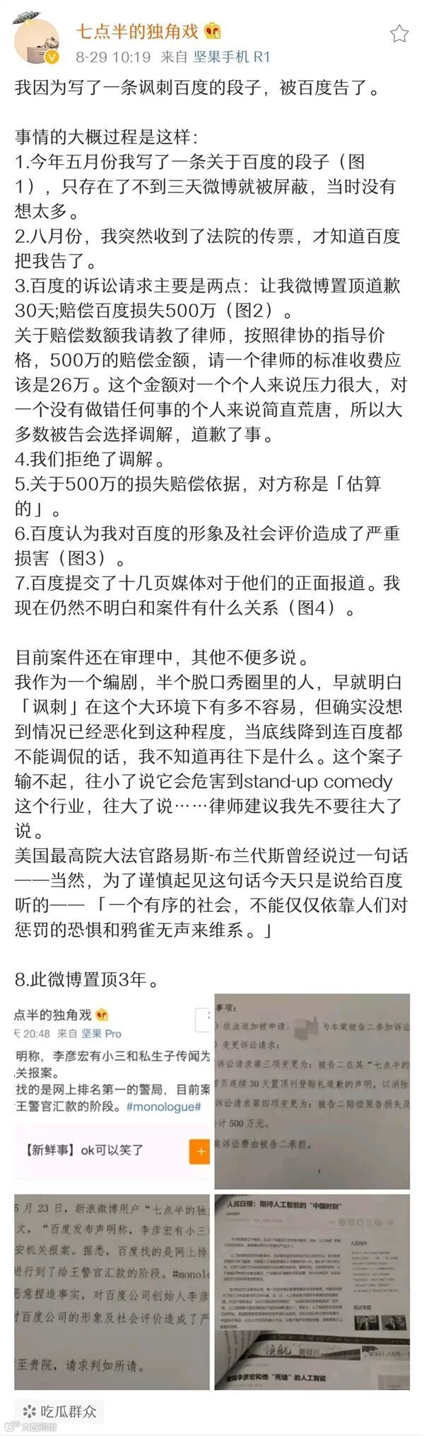 再之后不久,网友“七点半的独角戏”在微博称,自己因为这条微博被百度起诉了。