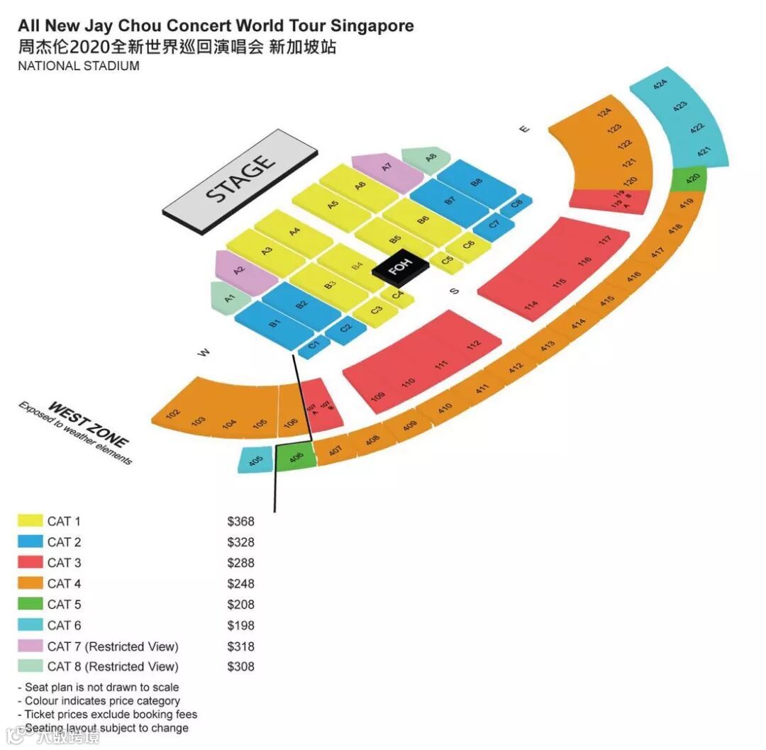 票价分为$368, $328, $318, $308, $288, $248, $208 和 $198 (未含$4 手续费)