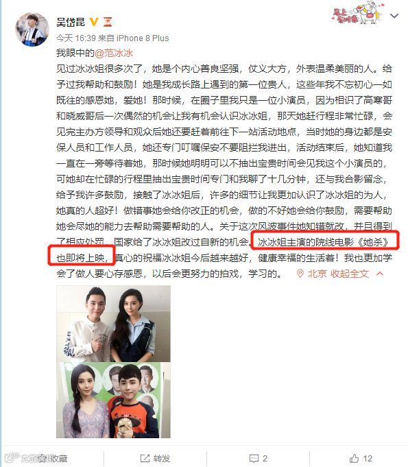 4月15日,演员吴岱昆也曝光了范冰冰的最新动态:范冰冰主演的电影《她杀》即将上映。