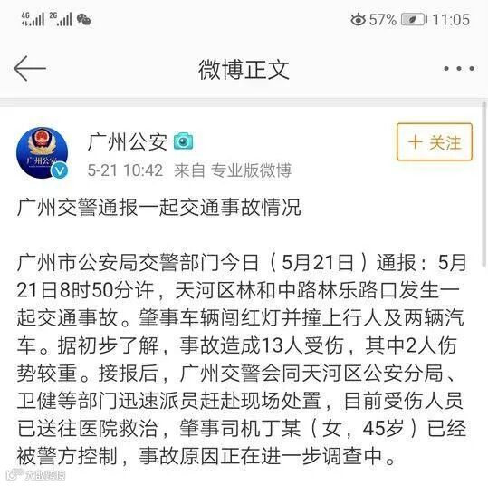 上午10许,广州公安官微发布通告,5月21日8时50分许,天河区林和中路林乐路口发生一起交通事故。肇事车辆闯红灯并撞上行人及两辆汽车。