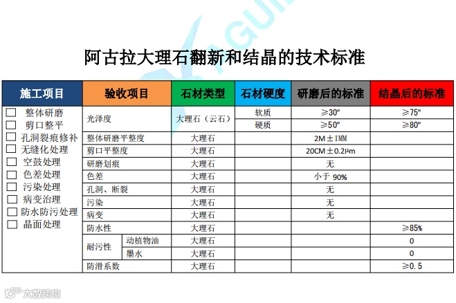 第七,验收标准不同。虽然中国石材行业协会关于石材翻新和晶面处理已经制定了相应的标准,但该标准并非是强制性的,每个项目可以根据实际情况经甲乙双方商讨确定验收标准。但高标准必然要靠高费用来支撑,所谓的高标准低收费是根本兑现不了的,因此验收标准越高价格一定也越高。