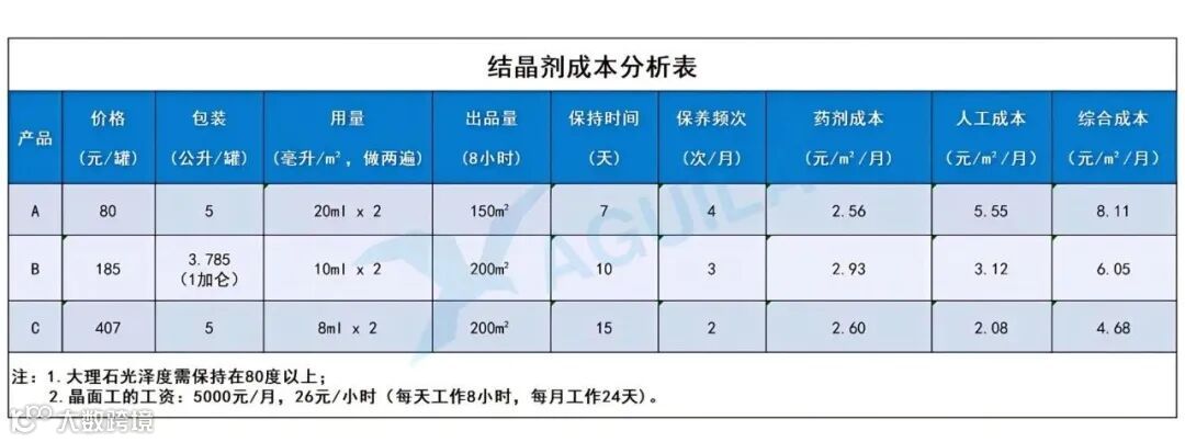 因此,我们选择结晶剂时,不仅要看价钱,还要测试和评估它的性能,也就是所谓的性价比。现在人工成本已占到施工成本的80%以上,如果这个结晶剂,虽然价钱贵些,但相对综合成本较低,那它才是我们明智的选择。俗话说,贵买便宜用,就是这个道理。以下是《结晶剂成本分析表》供大家参考。
